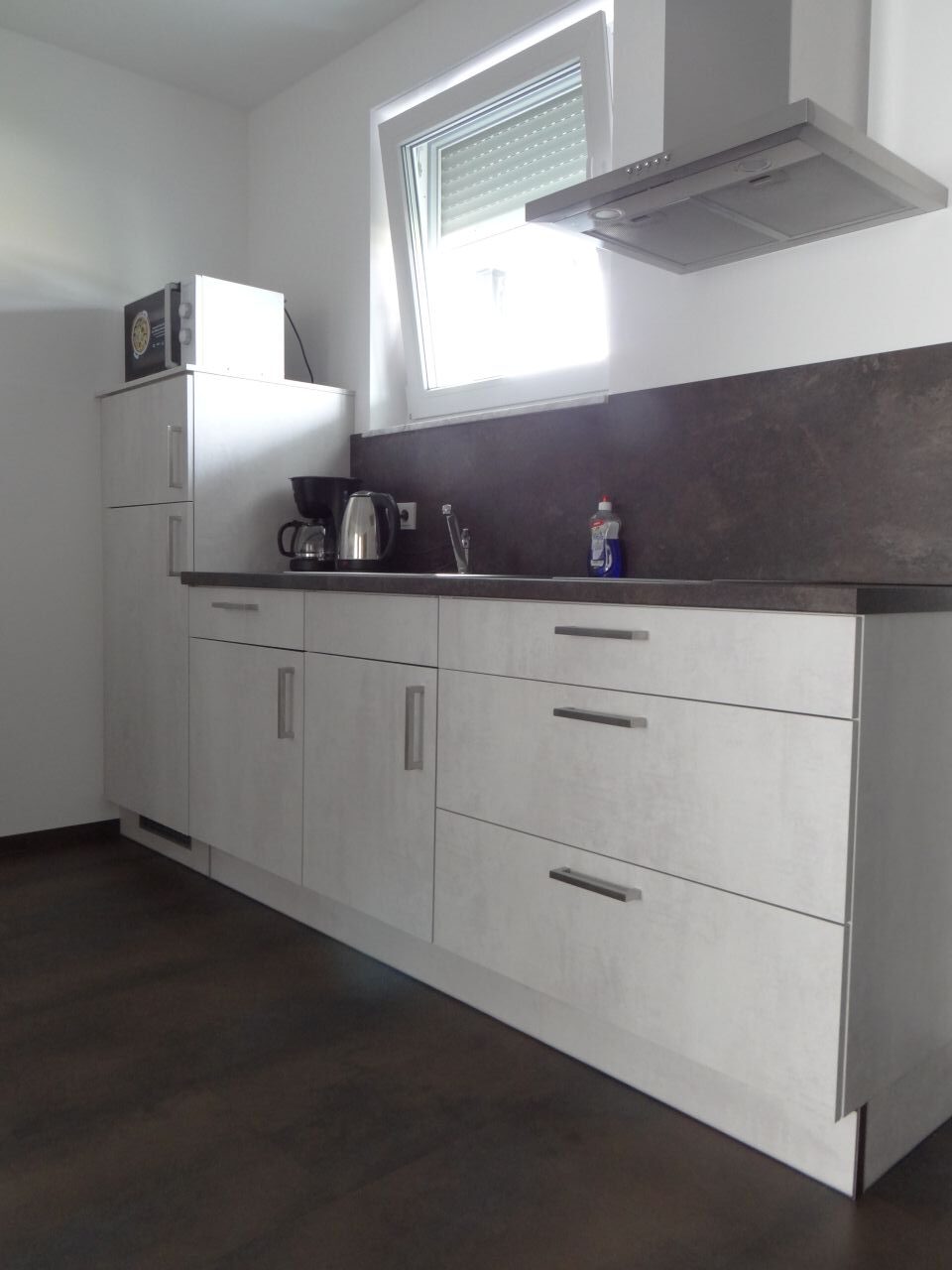 A kettle, a coffee machine, a microwave with a grill function. No oven
