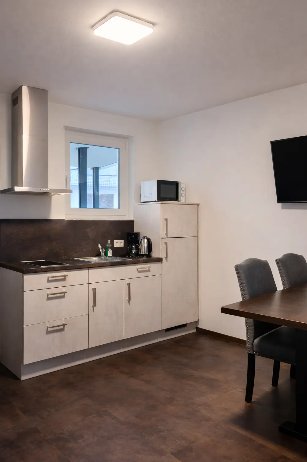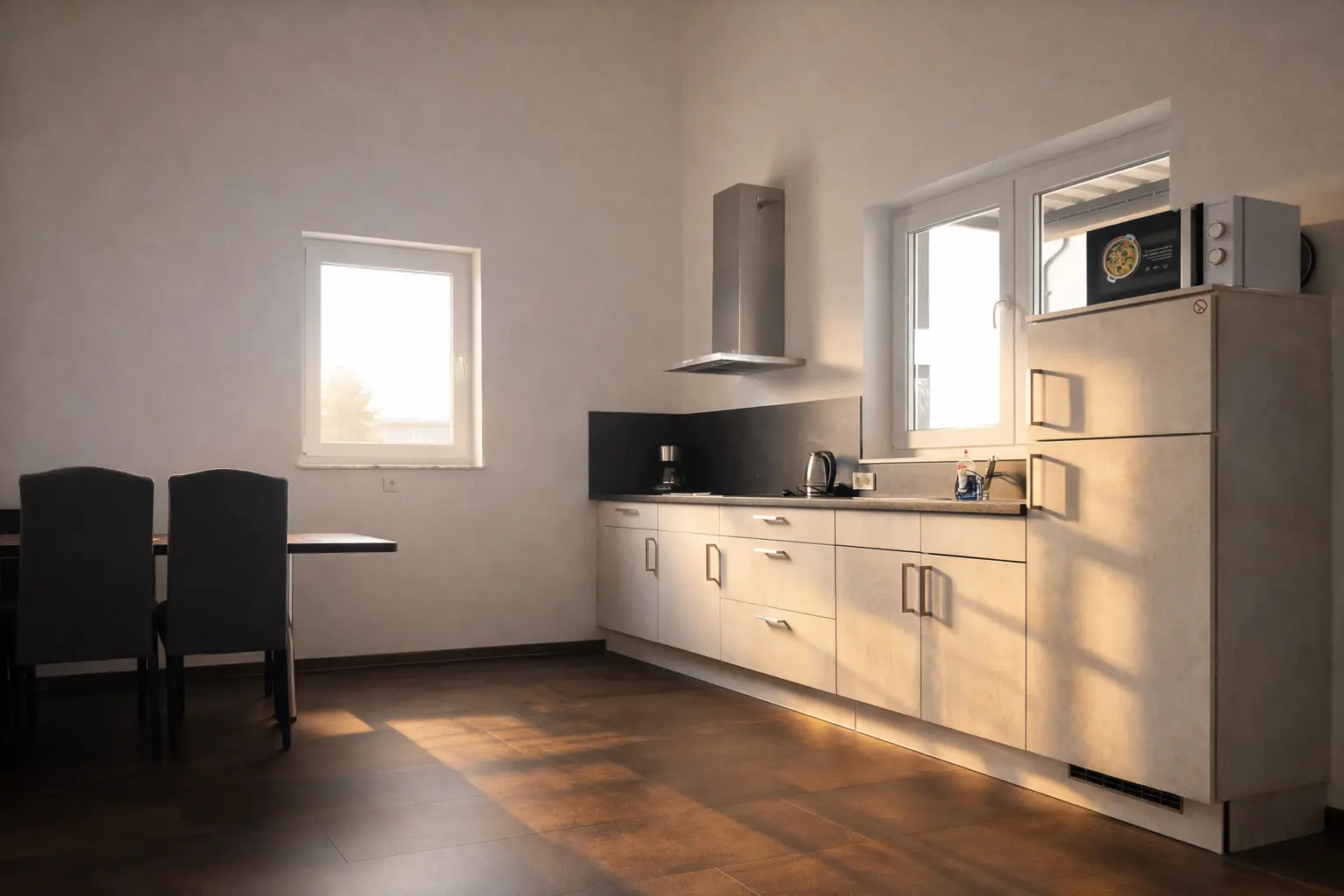 Unsere 50 qm großen Monteurwohnungen mit zwei Schlafzimmern verfügen über ausreichend Platz für bis zu vier Personen. Der Esstisch in der Küche eignet sich ideal für gemeinsame Mahlzeiten